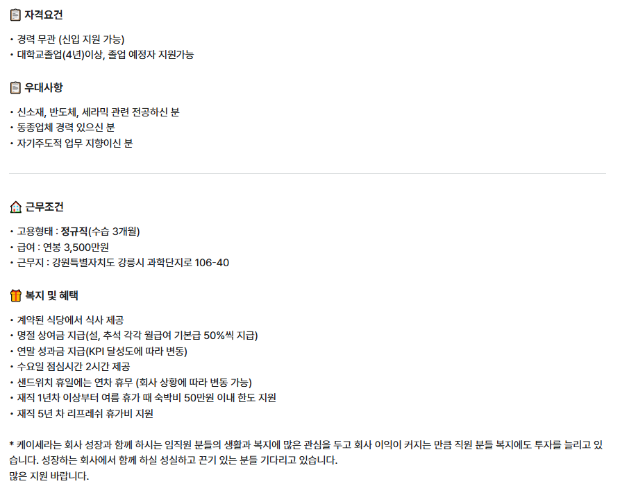 - 지원 링크: https://www.saramin.co.kr/zf_user/jobs/relay/view?isMypage=no&rec_idx=51333835&recommend_ids=eJxNzMkNwEAIQ9FqcscsBs4pJP13kaCRZnLj6QsH4JTop4Ar7xgGh7JIKO1UNSc2zcwRm5qqmZvSrPJTTQRnSlvIX1U29fziW56pWpX2ncMXJqQl7w%3D%3D&view_type=list&gz=1&t_ref_content=ing_intro&t_ref=company_info_view&relayNonce=42d0416c1fb43f3b35e1&immediately_apply_layer_open=n#seq=0